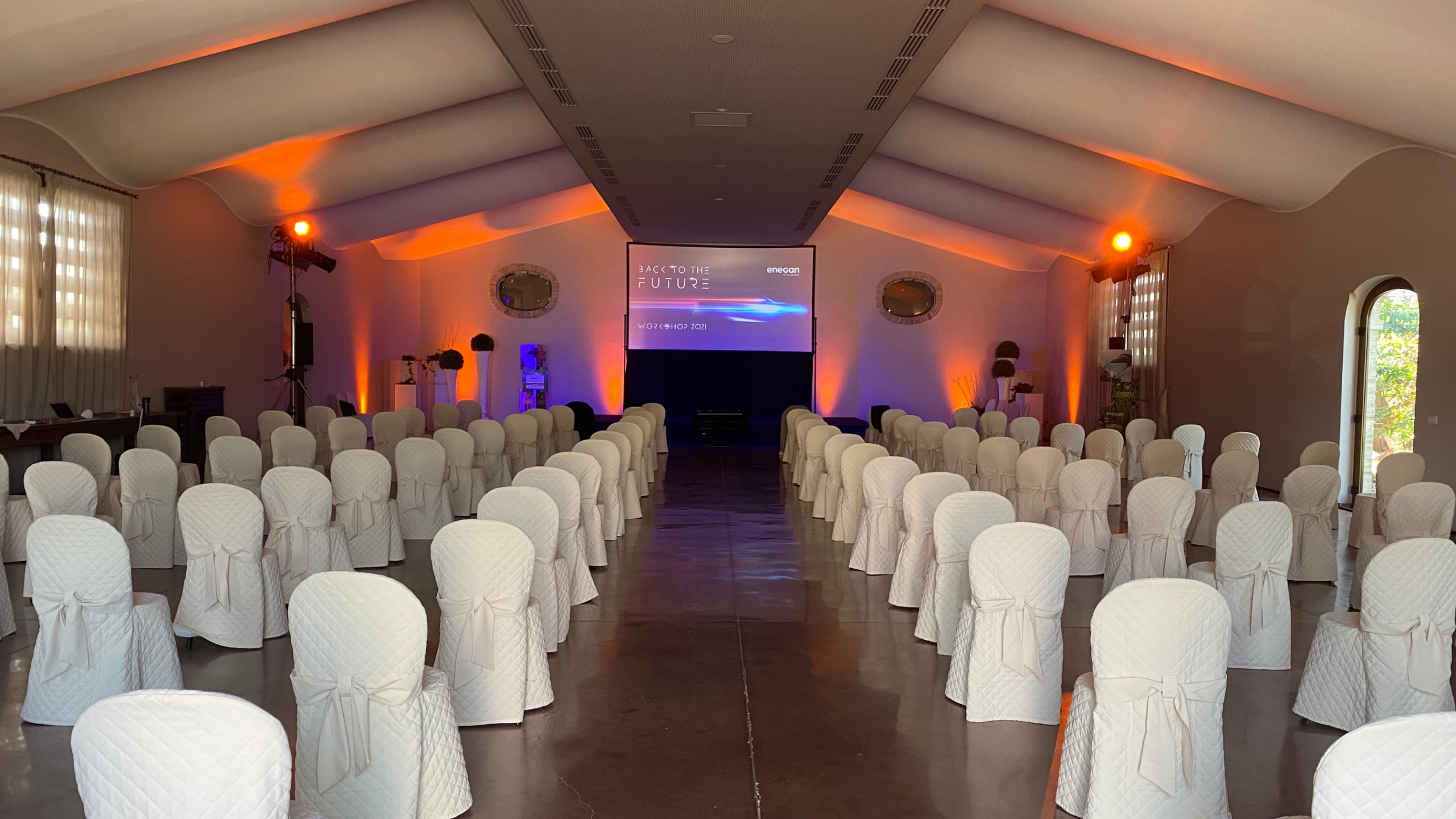 La sala Vela, ariosa e ampia, può ospitare fino a 300 persone.