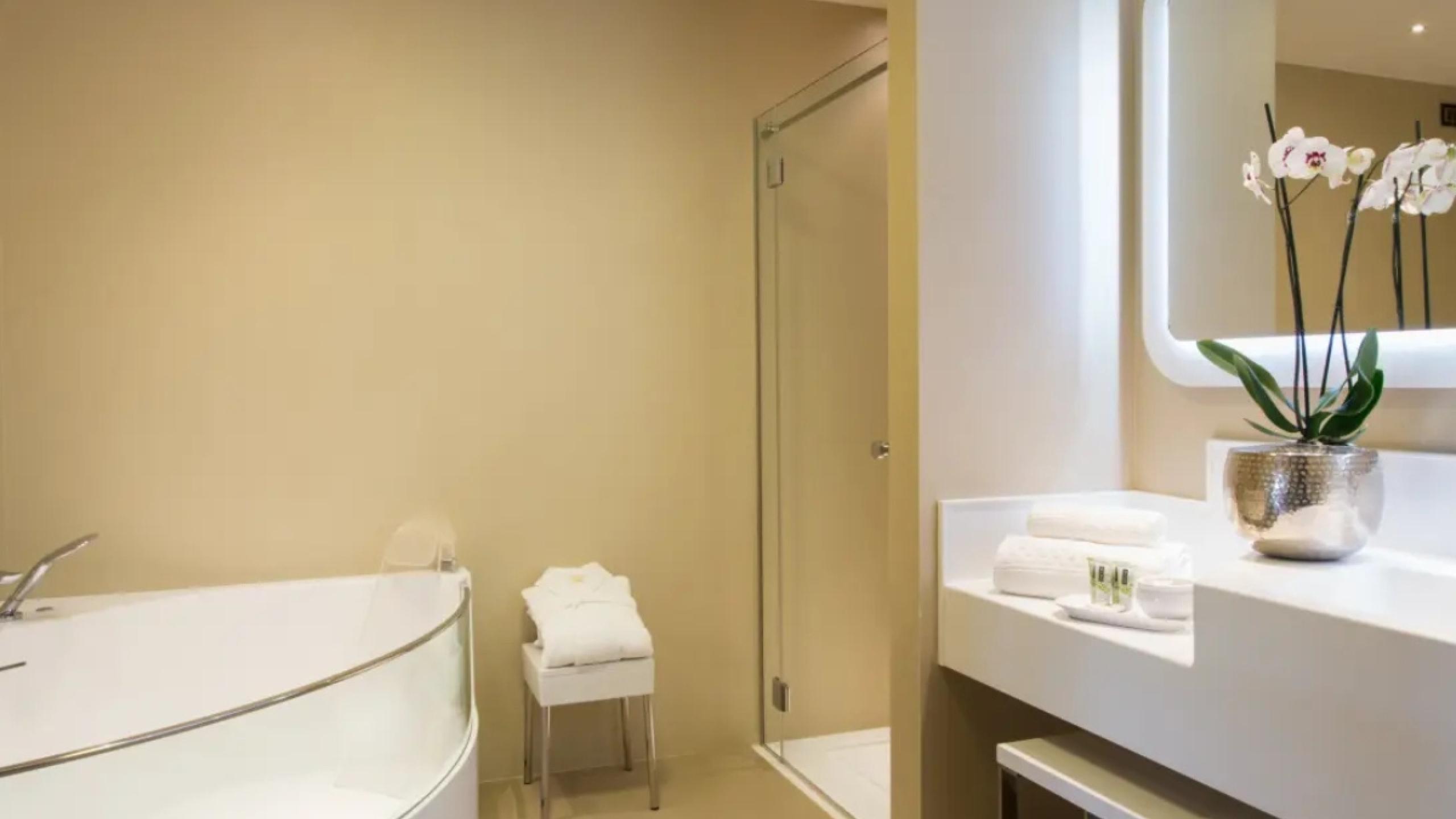 - Pernottamento in Wellness Suite: Una suite esclusiva con bagno turco privato per coccole infinite e una vasca idromassaggio per due in camera, il vostro tempio del relax, disponibile 24/24h!